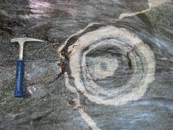 道志川の支流、室久保川の河床に目玉のような模様が見られます。この模様は「的様」と呼ばれており、伝承では昔、源頼朝が武道鍛錬のために作った標的ということです。他にもあったようですが埋もれてしまったそうです。このあたりの河床は閃緑岩のなかまでできています。全体(灰色の部分)が閃緑岩のなかまで、目玉模様の白い部分は別の種類のマグマが冷えて固まってできたものです。「的様」は“的”の周囲の閃緑岩のなかまをつくったマグマと“的”の白い部分を作ったマグマが完全に混じらずにできた模様です。マーブルケーキのマーブル模様のようなものです。