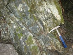 「的様」の下流、「道志の湯」の近くでは、変成岩の一種である結晶片岩が見られます。丹沢山地に見られる結晶片岩は、凝灰岩や安山岩・玄武岩等の火山岩が高い圧力によって押しつぶされてできたものです。高い圧力により、もともとの岩石を構成していた鉱物は別の鉱物につくり変えられています。 (地質担当学芸員 河尻) | |||||||||||||||||||