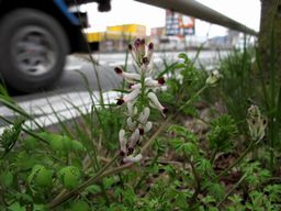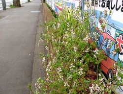 | 相模原市南区の、さらに南の端。国道16号線沿いのある一角に、神奈川県内ではここでしか確認されていないという、珍しい外来植物があります。外来植物なので、本来ここにあるべきものではありません。従って、珍しいからと言って絶滅危惧植物というわけでもありません。でも、神奈川県の中でたった1カ所、ここだけ。やっぱり注目せずにはいられません。 その植物とは、ニセカラクサケマン(ケシ科)。いかにも外来植物らしい名前です。外来植物の和名には、「よそ者」、「招かざる者」というニュアンスが込められたものが少なくありません。「ニセ○○」、「○○モドキ」、「イヌ○○」…。頭にイヌとつくのは、有用とされる植物に似ているけれど、あまり使い物にならないというような意味のようです。なんだかつけられた植物にも、犬にも失礼な話ですね。ちなみに、ニセカラクサケマンの本家扱いのカラクサケマンも、外来植物です。 さて、そのニセカラクサケマンですが、現在書店で市販されている図鑑でこの名前を探そうとすると、なかなか難儀です。私が知る限り、『日本帰化植物写真図鑑 第2巻』(全国農村教育協会,2010年)しかありません。地方限定の出版物や学術報告書などではほかにもありますが、いずれにせよ、極端に知名度の低い植物であることは間違いありません。 この場所でニセカラクサケマンが発見されたのは、2003年のことです。相模原植物調査会の会員が見つけて、『神奈川県植物誌2001』などにも記載がないことから、神奈川県新産であることがわかりました。以来9年経ちましたが、不思議なことに、周辺に広がりもせず、絶えることもありません。越年草なので、毎年しっかりと結実し、発芽、越年して代を重ねていることになります。 外来植物というと、在来の生態系に悪影響を与える特定外来生物がクローズアップされることが多いため、よい印象を持たれることはほとんどありません。事実、在来の植物の生育を脅かすような広がりを見せているものもあり、油断はできません。でも、視点を変えてみると、在来の植物の生育環境を人間が改変してしまった場所へ、外来植物が緑の穴埋めをしてくれている、という見方ができる場合もあります。少なくとも私は、外来植物すら生えていないような環境を、想像したくありません。 だからと言って、保護しましょうなどと言うつもりは毛頭ありません。しかし、幹線道路を走る自動車の風圧や排気ガスにも耐えて連綿と世代を重ねる姿に、ちょっと共感のようなものを抱いてしまうのも事実です。(生物担当 秋山幸也)