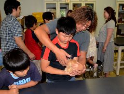 | 夏休みも後半の8月29日に、「小中学生のための生物学教室」を実施しました。定員を2倍近く超えるご応募をいただいたため、泣く泣く抽選して参加者を決めることになってしまいました。 さてその教室ですが、午前中は植物を扱い、花粉管の伸びるようすを観察するというオーソドックスな生物学の実験と観察を行いました。午後は、これまでやったことのない内容を試みました。それは、「生きものの持ち方教室」です。 講師は動物カメラマンの松橋利光さんと、ペットショップのオーナーの後藤貴浩さん。松橋さんは、両生類、は虫類を中心として図鑑や写真絵本で独自の世界を築いている人気カメラマンです。じつは、まさに「持ち方大全 プロが教える持つお作法」(山と溪谷社)という本も出している“持ち方マスター”です。後藤さんはもちろん職業柄、あらゆる動物を扱いますし、今回、なかなか手に取ることのできないいろいろな動物を持ってきてくれました。 生きもの好きが集まる教室ですから、子ども達、大興奮でした。ただ、これは持って遊ぶ教室ではないので、生きものを傷つけない、弱らせない持ち方をしっかり解説してもらいます。 今回扱う動物は、犬や猫などペットとして何千年もの歴史のある動物ではなく、いわゆる“エキゾチック系”(ペット業界や獣医師の間で、犬猫以外の動物をこう呼びます)。ウサギに昆虫に甲殻類に…そしてヘビやカエルなど。できれば人間になんて持って欲しくないと(たぶん)思っている動物ばかりです。松橋さんによると、コツは、「動物にあきらめさせること」。つまり、暴れさせず、どうにもならない、降参、と思わせる持ち方が大事だということを教わります。 それでも、気持ちを抑えきれないのが生きもの好きの子ども達。自分たちもまるっきり同じだったので、なでまわしたり肩にのせてみたり、多少のことには目をつむります。それよりも、普段持ったことのない、あるいは、持てるなんて思ってもみなかった動物を持てたという記憶を持ち帰り、そして、その生きものをこれから身近に感じてもらえればこの教室の目的を果たしたことになります。さて、教室参加者の子ども達、今頃は「飼いたい!」とおねだりしておうちの人を困らせているかな? (生物担当 秋山幸也)