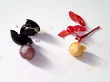ところが、見ているとどうもこれらの果実は、売れ行きが芳しくありません。樹木の果実は一般的に、豊作と不作を周期的に繰り返します。秋深く実るドングリやそのほかの果実の不作が重なった年は、これらの真冬の果実もよく食べられています。しかし、年によってほかの果実が豊作だと、とうとう食べられずに春先まで残ってしまうことがあります。 こんなに美味しそうに実っているのになぜ?と思い、これらの果実の中身を割ってみることにしました。なんと、ヤブランやマンリョウは、果実とほとんど同じ大きさの種子が一つ入っているだけでした。果肉はほとんど無く、わずかに汁があるだけ。ノイバラは水気が無く、お世辞にも美味しそうなシロモノではありません。