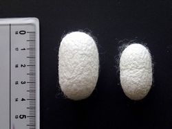| 5月下旬、博物館では今年もカイコの飼育を始めました。掃き立て(ふ化した毛蚕を飼育台へ移す作業)から3週間とちょっと、熟蚕に育て上げて6月中旬には無事、繭となりました。 この間、カイコはふ化直後の全長約2.5mmから、5齢(終齢)の半ば、最大で約8cmまで成長します。なんと30倍!1か月にも満たない期間でこれだけの成長を遂げる生きもの、それがカイコです。 そのかわり、食べる量は齢期が進むにつれて加速度的に増大します。5齢に脱皮してからは、相当がんばって給桑しても追いつかないくらい、勢いよく食べてくれます。かつて相模原でも養蚕が盛んだった頃、5齢になると家族が交替で24時間体制で給桑していたという話を聞きますが、この食いっぷりを見れば納得です。 さて、この時期、シーズンの最初に育てるカイコを春蚕(はるご)と呼びます。カイコの野生原種に近いとされるクワコも同じタイミングでふ化、成長するので、カイコにとって本来の生育シーズンと言えるでしょう。瑞々しい良質なクワの葉をあげられるし、夏ほど気温が高くないため、成長が早すぎることもありません。これは、養蚕学の大きなテーマであった「大きな繭=長い繊維」をとるための必須条件です。実際、昨年秋に育てた晩秋蚕(ばんしゅうさん)の繭と比べると、大きさの違いは歴然としています。