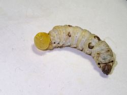 繭の大きさだけではありません。芽吹いてから時間の経った水分の少ない葉をあげていると、どうしても病気の蚕が多発します。代表的なものは、脱肛です(写真は昨年の晩秋蚕)。かわいそうですが、このようになったカイコはまゆを作れずにそのまま衰弱死してしまいます。 クワを専門に食べるカイコにとって、やはり新緑の頃が一番条件の良い季節ということになります。良質なクワをしっかり食べさせることができた今年は、特に大きな繭をとることができました。 繭と言えば、先ごろ、群馬県の富岡製糸場と絹産業遺産群が世界遺産に登録されることが決定しました。このニュースに刺激されたのでしょうか、今年は市内の小学校から「カイコの卵を譲ってほしい」という要請が例年よりも多くありました。博物館ではできるだけ要望にお応えし、卵を提供する際には必ず農業としての養蚕について理解を深めていただくため、学芸員が出張授業を行っています。日本の近代化を支えた養蚕から、生物資源として新たに注目を集めるカイコを、これからも学習教材として積極的に扱っていきたいと考えています。 (生物担当 秋山幸也) |