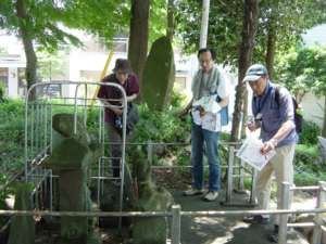 | これまで「ボランティアの窓」の欄でも、多くの市民の皆様が博物館を舞台にさまざまな活動をしていることを紹介してきましたが、こうした博物館での市民の活動はもちろん当館だけではなく、各地の多くの博物館でも積極的に行われています。今回紹介する横浜市歴史博物館の「民俗に親しむ会」もそうした組織の一つです。 横浜市歴史博物館は当館と同じ平成7年に開館した博物館で、横浜市都筑区の港北ニュータウンの一角にあるその名の通り歴史系の博物館です。「横浜に生きた人々の生活の歴史」を時代ごとに展示する一方、約2000年前の弥生時代中期のむらと墓地が完全な形で発見されたことで著名な大塚・歳勝土遺跡に隣接し、随時、遺跡の解説ボランティアなども行われています。 横浜の「民俗に親しむ会」は平成21年度に結成され、鶴見川をテーマに鶴見川源流の町田市上小山田から下流に向けてフィールドワークを実施し、23年2月には鶴見区生麦の旧鶴見川河口に到着しており、現在、そのまとめの作業中とのことです。この会の結成に当たっては、私(加藤)もいささか関わりを持っていることもあり、昨年11月に当館で実施した「学びの収穫祭」には「民俗に親しむ会」の皆様も参加され、当館のボランティアの活動についての発表を聞いていただきました。また、「学びの収穫祭」には横浜市歴史博物館のほか、平塚市博物館とパルテノン多摩で活動されている平塚市民及び多摩市民の皆様も参加され、当館を含めた四館の民俗関係の会で活躍されている市民同士がそれぞれの会の状況や特色、課題などを話し合う交流会も開催しました。 そして、5月27日(日)には横浜から「民俗に親しむ会」の皆様を相模原にお招きし、当館の「民俗調査会A」の会員と合同のフィールドワークを行いました。当日参加されたのは横浜から8名(ほかに学芸員2名)と相模原の15名(別に加藤も加わりました)の総勢26名で、場所は田名地区として四ツ谷集落の石神社から水郷田名方面に歩いていきました。途中、現在でも横浜に水を送っている横浜水道の水道道では横浜と相模原のつながりを改めて確認し、鶴見川とはまた違った相模川の大河の風景は横浜の皆様にも大きな印象を残したようです。全体のコースの設定や当日のポイントでの説明は加藤が主に当たりましたが、相模原の調査会の会員も得意なところでは解説を行い、また、地元の銘菓を振舞ったり、自家製のお菓子を用意した会員もいました。こうして相模原の神社や寺院・石仏などをフィールドワークして、相模原と横浜の違いなどいろいろなことをそれぞれ感じながら、さらに新緑のさわやかな風の吹く中、いろいろなことについて話し合うなど、相互の交流を深める絶好の機会となりました。 現在、各地の博物館で活発な市民活動が見られ、博物館と市民との協働は特段珍しいことではなく当たり前のこととなりました。これからも各館で行われているさまざまな活動をお互いに認識し、良いところは参考にするなど高め合うことが必要であり、加えて、そうした多彩な活動が多くの博物館で見られることを広く社会にアピールしていくことも重要です。横浜の「民俗に親しむ会」との交流は、次回は10月に相模原の会員が横浜を訪れ、今度は横浜市の皆様に御案内いただくことになっています。このような活動を今後とも他の館も含めて企画していき、さらにより良い展開が図れることを願っています(民俗担当 加藤隆志)。