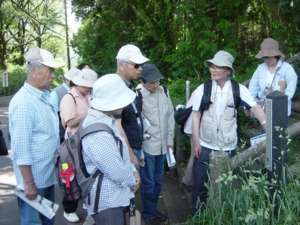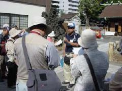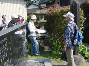 当日は、午前9時30分にJR鶴見駅に集合し、まず旧東海道を、冨士塚などが残る鶴見神社(旧の名称は杉山神社)や一里塚を見学しながら進みました。さらに、薩摩藩士が英国人を殺傷した生麦事件にちなむ碑や、魚屋が列を成して並ぶ生麦の通り、「蛇も蚊も」の名称で有名な6月第一日曜日の祭礼の舞台となる神明社及び道念稲荷社、鶴見川の旧河口などを経て、今でもレトロ感あふれる国道駅から鶴見線に乗り込みました。