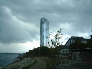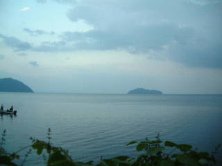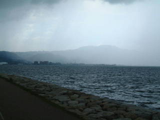 曇ってきた。水面が荒れてきた。右手の町には雨が降っている。