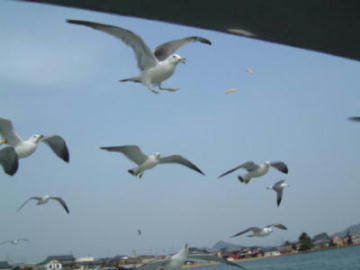 よく見ると左側の写真には投げられたえびせんが映っているハズ....。