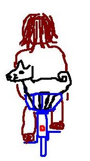 この前 爆笑写真館で ネコを 肩に乗せて自転車をこぐオッチャンの写真を 掲載したが、 また 今度は おばちゃんが 大人の雑種犬を、後ろの 子供が乗る いすに乗せて走っているのを目撃!! しかし なんとデジカメ持ってない!! ・・というわけで今回は 図画工作 2 だった 僕の絵で勘弁してください。 しかし メチャクチャ下手です。 その犬は 結構大きい割りに、荷台が狭くて 困ったような顔をして乗ってました。 しかし この前のネコ も イヌも 決して 幸せそうに見えなかった。 |