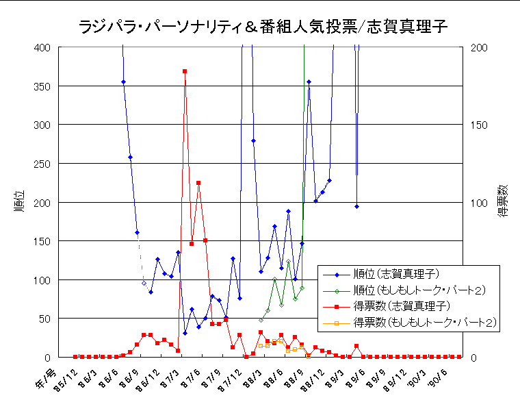 ラジパラ・パーソナリティ人気投票において、志賀真理子ちゃんは86年7月号にて初のランキング。得票数は1票。その直前の6月1日に「ポニーテールに乾杯!」がスタートしたためと思われる。