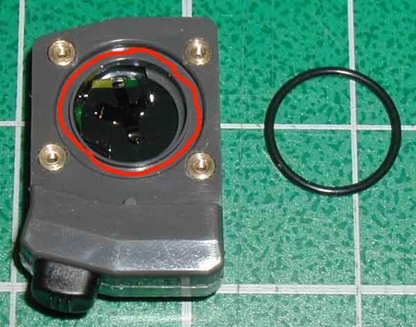 写真右がオーリングと言って、電池部分に水分やゴミが入るのを防いでいる部品です。 もしこれが外れてしまった場合は、写真左側の赤丸(円だと思ってください(^^;))に沿ってはめ込みます。 溝に沿ってすっぽりはまるはずですので、リングのねじれや溝からずれることが無いように組み付けてください。