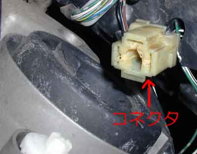 コネクタを取り外します。渋いことがありますが頑張って下さい。 いつものことですが、配線を引っ張るのは厳禁です。必ずコネクタを持つこと。 外し方としては真後ろに引っ張るのが基本です。 それだけで外れてこない場合は上下左右に揺するといいでしょう。 揺すりすぎると端子を破損させる原因となりますので、ほどほどに(^^:) コネクタについているどろどろしたものは、腐食防止用のグリスです。 ふき取ってはいけません。