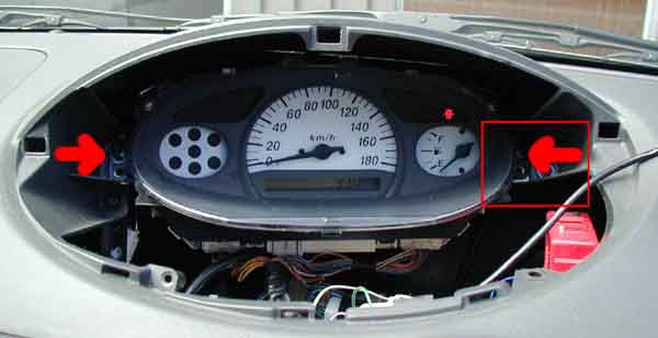 メータフードを取り外したところです。 メータはネジ2本で固定されています。 デジタルメーターは4本です。 2本はアナログと同じ場所、もう2本は手前側にあります。 メータ写真の右側、赤四角の部分のアップです。 暗いですが、矢印のネジを外します。 このとき、誤って下に落としてしまうとかなり大変そうなので気を付けましょう(^^:) 取り付ける際は、メータ側の穴と、車体側の出っ張りを合わせます。 合わないとネジ穴も合いませんので分かると思います。