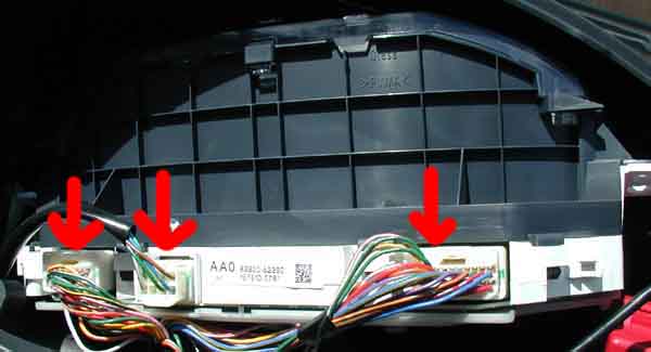 メータ固定のネジを外し、下側が見えるようにひっくり返したところです。 矢印のコネクタ(3個)を外します。 デジタルメータの場合、コネクタの数や配列が違う可能性がありますが、 全部外さなければならないのは同じです。