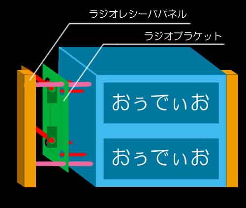 下手な絵で申し訳ないのですが、部品の相関図です。 1DINが縦に2つ並び、それを固定するためのラジオブラケット、 さらにその上から、左右の隙間を埋めるためのラジオレシーバパネルを取り付けます。 一体型オーディオを使用していた場合は、 外枠であるオーディオパネルも用意する必要があります。