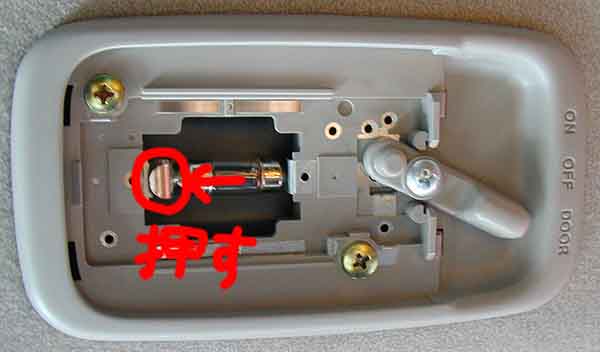 ランプカバーを取り外したところです。 赤丸内のベロみたいなのを矢印方向に押すとバルブが外れます。 片手はバルブに添えた方がいいでしょう。 分かりづらいのでもう一枚。