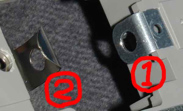 バルブを外した状態です。 左右の穴にバルブ両端が挟まるような形になります。 取り付ける際は、最初に写真右側(1)の穴にはめた後、 (2)のベロを広げつつ穴にはめるという手順になります。 実際にやればすぐ分かるから大丈夫ですよ(^^:)