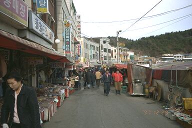 日が沈んでくるとかなり寒い。が、負けずにほっつき歩く。束草の地図を探して本屋に入っ たが、束草の地図というのはなかった。ドライブ用の分厚いロードマップには出ていそうだ がそんなもの買っても重いだけである。韓国で言葉を交わした韓国人の中でもっとも愛想が 悪い、しかしちょっと美人の店員アジュマが江原道の地図しかないと言うので、それを買っ た。あとで広げて見たが、街歩きにはなんの役にも立たない。