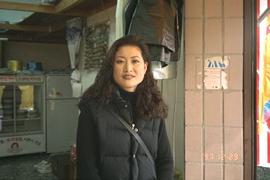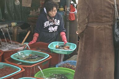 がっしりした建物の水槽で魚やイカが泳いでいるかと思えば、地べたに御座を引いて座った ハルモニがなにやら干物を売っている。自分は「海の家」の方で食べてみようと物色した。 どこでも同じだろうと思ったが、だれも客がいないところより繁盛してるところの方がたぶ ん安いか早いかサービスがいいのだろう。味に差があるとは思えない。2回ぐらい往復して みて、なんとなくこのアジュマのところにした。よく動くので少しぶれてしまった。ザルに ヒラメとイカとホヤと、名前のわからないひかりもの(知ってる魚だと思う)が載っていて、 アジュマがここでサシミにする。1万5千ウォンだった。実際はサンチュとゴマの葉とニン ニクとコチュジャンとワサビのセットが5千ウォンで、計2万ウォンだった。