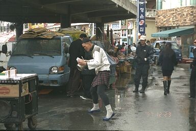 「海の家」を出ると、異様なアジョッシに出くわした。化粧をしてスカートを履いたごつい 男が屋台を引きながら音楽テープを売っている。そして時々屋台を道の端に停めて、曲に合 わせて踊り出す。仁寺洞の大道芸よりもさらに怪しい。このジャンルの音楽はなんとかいう のだが忘れてしまった。かなり近くまで寄ったが、買わなかった。