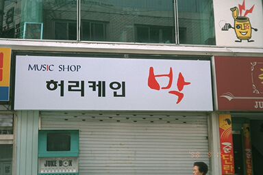 新堂洞での収穫は「ホリケイン・パk」というMusic Shopの看板である。自分が初めて買った韓国音楽のCD、DJ DOCの「Summer」に同名の唄が入っている。まだスナック通いだけで韓国に来たことがなかった頃、ママの娘スヨンに勧められて、そのCDを近所の韓国雑貨屋で買った。ダンスにラップに過激な歌詞、という彼らがちょっとふざけて(かどうかは知らないが)唄った演歌調の曲が、その「ホリケイン・パk」である。最初の韓国旅行の直前に、「シンダンドンでそのホリケイン・パkに会って来る」なんて冗談を言ったのを思い出した。結局その時はこんな大きな看板すら発見できず、ただほっつき歩いただけで帰った・・だからその「ホリケイン・パk」看板は、自分にとってなんだかノスタルジックなのである。その写真を撮る自分の姿は、ジョンシク君には可笑しかったかもしれないが、自分は万感の想いを胸に(また大袈裟な!)シャッターを押したのである。